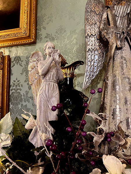 Singing the familiar tunes, angels play a prominent part: “the angel of the Lord came down, and glory shone around”. We are encouraged to “hear the angel voices”, “the angelic host proclaim his birth,” and “In the Bleak Midwinter” “Angels and Archangels May have gathered there, Cherubim and seraphim Thronged the air”. The original church here at Highclere was named St Michael and all Angels and most years in our Christmas decorations, angels quietly make their way through many of the Castle rooms.