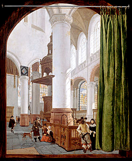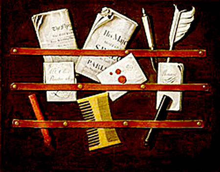 Illusion art reached new heights in the 17th century, particularly among Dutch artists, who achieved extraordinary levels of realism. Often such murals might depict a window, door, or hallway, intended to suggest a larger room. One of these artists, Evert Collier produced many paintings for the English market. His illusionistic letter racks were and are so convincing, we try to reach out for the well-thumbed piles of papers carefully tucked behind either straps – but if we try, we would find we had been fooled.