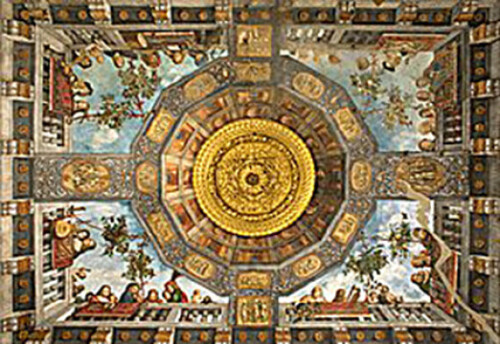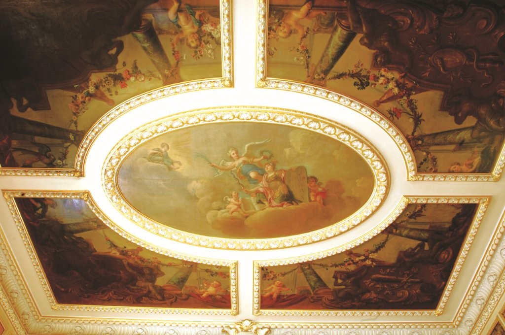 At Highclere, the Music room has a beautiful painted ceiling by the artist Francis Hayman which depicts Athene Rising. Although he was an English artist working in the 18th century, the centrepiece is an approximate example of this kind of ceiling heightening effect. It is hard to say though as it is likely that the painting was originally made for a smaller room before being removed and replaced, firstly in the Georgian and, later, in the Victorian rebuilding of Highclere.