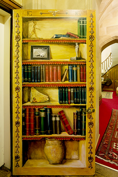 A better but entirely modern example of such "illusion painting" can be found on the door between the Saloon and the Smoking Room. Painted by a girlfriend, the door is disguised as a bookshelf with books, a vase and some photographs. It is particularly mischievous, because whilst at first sight the books appear to be entirely conventional, each title has been tweaked to reflect either my husband and myself, our family or various members of staff. As a private joke between those of us at the castle, it is entirely in keeping with the ideals of those 16th century Dutch artists.