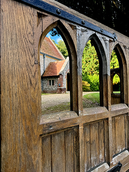 Although relatively “new” in terms of many English churches, as it is merely Victorian, Highclere’s parish church still has a satisfactory feeling of age and stability. To enter you have to turn a large circular black ring handle whilst simultaneously giving the heavy silvered door a jolly good push. The hinges creak rather satisfactorily creating a sense of anticipation and a further door then leads from the lobby into the main nave of the church.